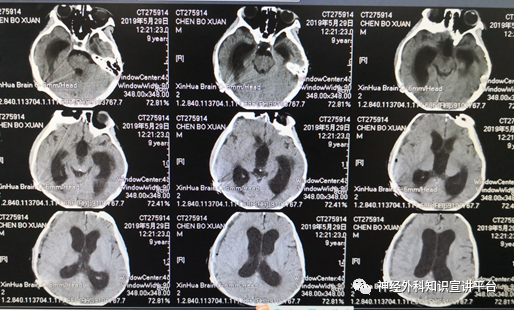 患者出现急性脑积水,GCS评分6分,调压至50mm水柱,查CT示脑积水进一步加重,颞角扩大更加明显。