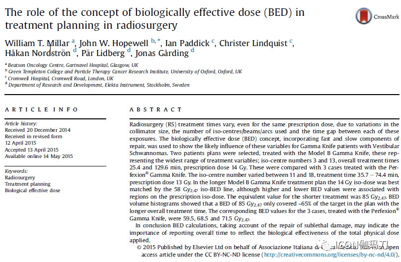 《Physica Medica》杂志 2015年9月[31(6):627-633.] 刊载Millar WT , Hopewell JW , Paddick I , Lindquist C , Nordströn H , Lidberg P , Gårding J 撰写的《生物有效剂量(BED)概念在放射外科治疗计划中的作用。 The role of the concept of biologically effective dose (BED) in treatment planning in radiosurgery.》(doi: 0.1016/j.ejmp.2015.04.008.)