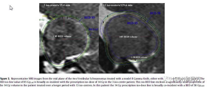 图3、典型的MRI图像来自使用B型伽玛刀治疗的两例前庭神经鞘瘤的中间平面,,3个等中心点(左)或13个等中心点(右),85 Gy2.47的生物有效剂量等量值与3个等中心点患者的14 Gy处方等剂量线值大体一致。在使用13个等中心点较长时间治疗的患者中,这条等生物有效剂量线覆盖了相当小的14G的y体积比例。在这个病人中,14 Gy的处方等剂量线与58 Gy2.47的生物有效剂量基本一致。