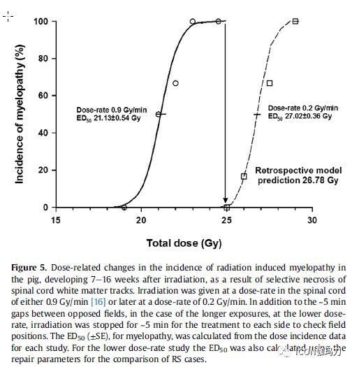 图5、猪放射性脊髓炎发生率与剂量的相关变化。在照射后7-16周内进展,出现脊髓白质由于选择性坏死的痕迹。对脊髓以剂量率0.9 Gy/min照射,或以后期的剂量率为0.2 Gy/min照射。包括有5分钟的对侧野的照射间隔,在较长曝露辐射的情况下,以较低的剂量,停止辐照约5分钟,以使每侧治疗时检查照射野的位置。放射性脊髓炎ED50(±SE的发病率按每一个研究剂的计算发病率数据计算。对于较低剂量率的研究,ED50也使用也使用修复参数来比较放射外科病例。