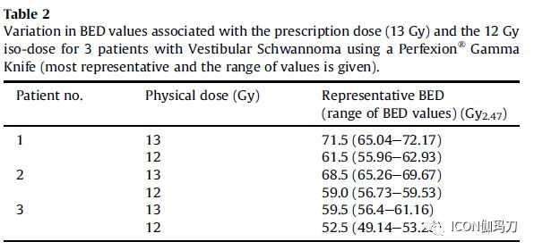 表2:3例使用Perfexion®伽玛刀治疗的前庭神经鞘瘤患者与处方剂量(13Gy)和12Gy等剂量线有关的生物有效剂量值的变化(给出的最具代表性的和取值范围)。