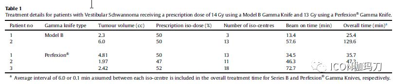 表1:使用B型伽玛刀受照处方剂量14 Gy和使用Perfexion®型伽玛刀受照13 Gy的前庭神经鞘瘤患者的治疗。