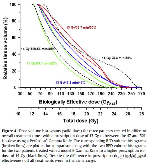 图4、使用Perfexion ®伽玛刀治疗的3例总的治疗时长不同,处方剂量13Gy,等剂量线47 - 52%之间的体积直方图(实线)。相应的生物有效剂量体积直方图(虚线),与两例采用B型伽玛刀治疗的患者的体积直方图进行比较,后者的处方剂量较高为14Gy(黑线)。尽管处方剂量有所不同,但所有治疗的生物有效性在同一范围内。