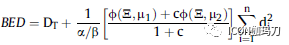 ϕ(Σ,μ)是一个复杂的函数,修复率参见参考文献; 剂量率的影响,等中心点内时间(inter-iso-centre Time)和暴露时间(exposure time)是通过这个功能调节的。“μ1”和“μ2”代表两个亚致死的辐射损伤修复率,与曝光时间延长有关,“c”分隔系数与慢速修复(“μ1”>“μ2”)有关。应该指出的是,两者之间的绝对分区修复过程μ1和μ2,分别是1.0 /[1+c]和c / [1+c}。总剂量DT是通过治疗将不同剂量总和辐射到特定的体积元,由“n”个等中心点辐照,“di”(i=1,n)是“n”个不同的等中心点各自所提供的辐射剂量。这个模型的推导和ϕ(Σ,μ)的定义可以在其他地方找到。大鼠脊髓实验中,使用不同剂量率单剂量辐照推导出本分析中使用的正常中枢神经系统组织的修复动力学参数值。修复亚致死辐照损伤的半修复时间为0.19 小时 (ln2/ μ1)和2.16 小时(ln2 / μ2);分隔系数为“c ”(0.98),相关的α/β值为2.47 Gy。类似的α / β值和修复的半修复时间(half-times for repair)已经从使用常规分割放射治疗的研究中得到,两者都有完整或不完整的分割间歇内的修复间隔(half-times for repair),或低和极低的剂量率已经在别的文献中详细讨论过。应该特别指出的是,这些修复过程被认为是同时起作用,导致复合性的组织效应(composite tissue response)。这些值已被采用以供目前使用的研究计算生物有效剂量对正常脑干的影响;肿瘤的治疗会引起正常组织结构的某系压迫。没有前庭神经鞘瘤可供比较的放射生物学参数,但对于这种生长缓慢,分化良好的肿瘤,有理由认为可能与正常中枢神经系统组织类似。