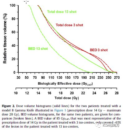 图2、如图1所示使用B型伽玛刀(处方剂量为14 Gy,最大剂量28 Gy )治疗的2例患者的剂量体积直方图(实线)。比较两例患者的生物有效剂量体积直方图(虚线)。生物有效剂量值为85 Gy2.47,这是最具代表性的用3个等中心点治疗的患者中,使用13个等中心点治疗的患者14Gy的处方剂量仅约占病灶的65%。