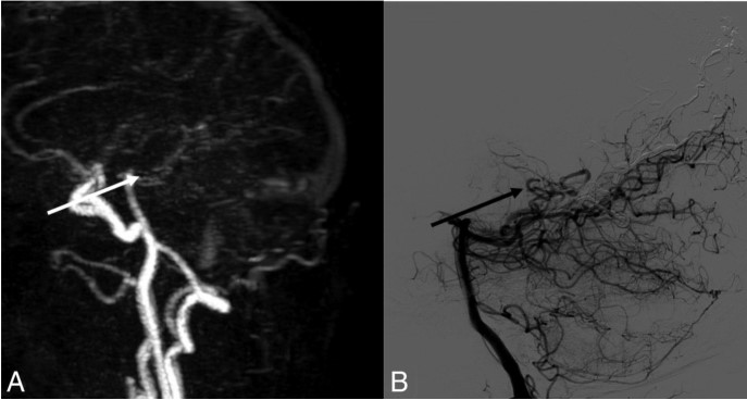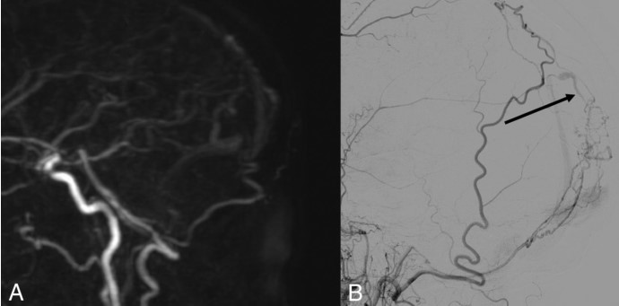 图3. A.动脉晚期4D-MRA矢状位。B.经左侧颈外动脉行脑血管造影矢状面。B中的黑色箭头显示枕静脉早期显影,A中未发现动静脉分流。