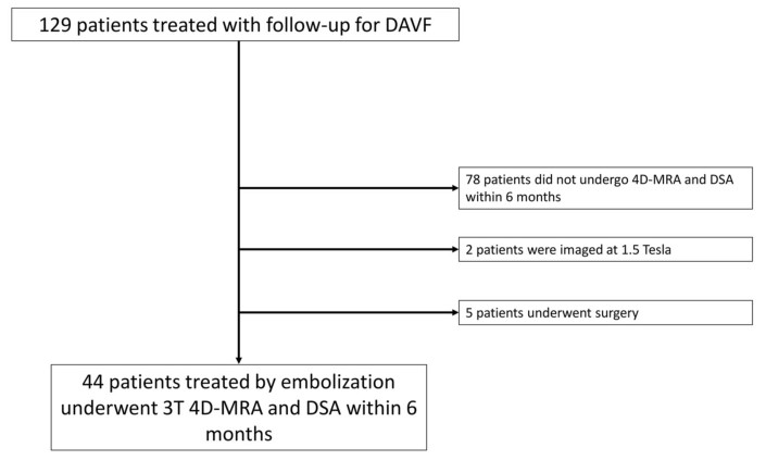 纳入2008年8月至2019年5月接受栓塞治疗DAVF,并接受了4D-MRA和DSA随访的患者,两项检查间隔在6个月内,其间未进行治疗。主要终点是以DSA作为参考标准,评估4D-MRA诊断DAVF准确性和在治疗过的DAVF患者中检测DAVF残留或复发的准确性。次要终点是以DSA作为参考标准,评估4D-MRA诊断高出血风险残留或复发DAVF的准确性。4D MRA图像质量评分为被分为四级:0级(无可信度)、1(低可信度)、2(中等可信度)和3(高可信度)。两名研究者独立评估4D-MRA和DSA图像上残留或复发DAVF的存在。若存在DAVF,评估DAVF的Cognard分型并根据出血风险将患者分为低出血风险组(Cognard I,IIa)和高出血风险组(Cognard IIb,IIa+b,III,IV和V)。