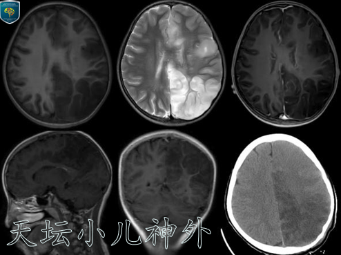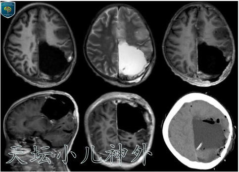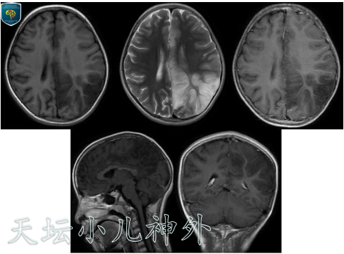图1患儿2020年1月MR,可见病变弥漫,呈长T1长T2混杂信号,未见明显强化