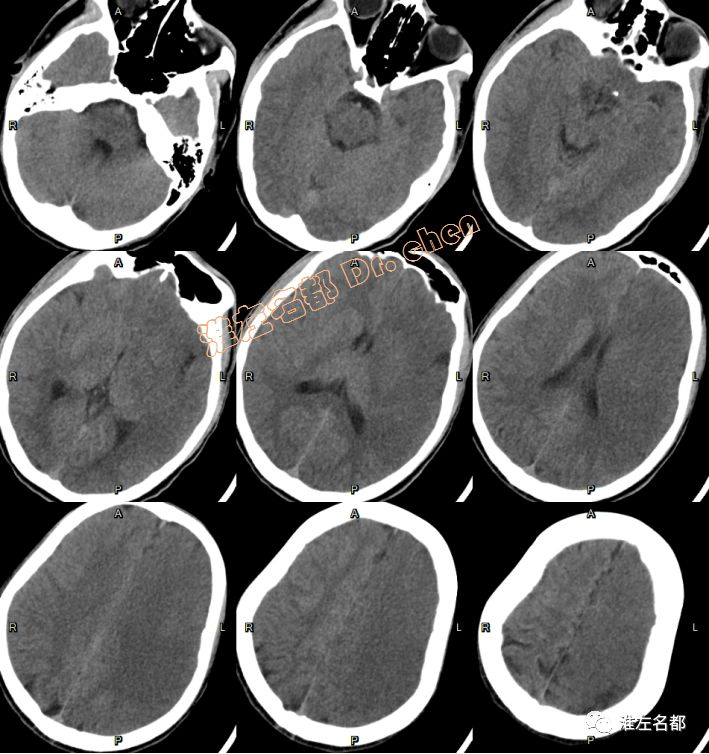 △颅脑CT平扫+增强:左侧基底节区和部分额叶呈稍高密度,左侧前循环血流通畅;左侧半球肿胀明显,脑室、脑沟和脑池受压,中线结构向右侧显著移位。
