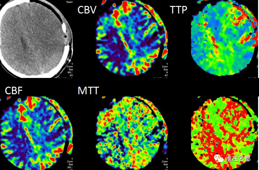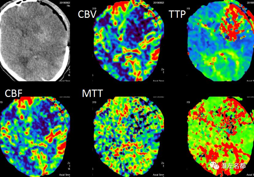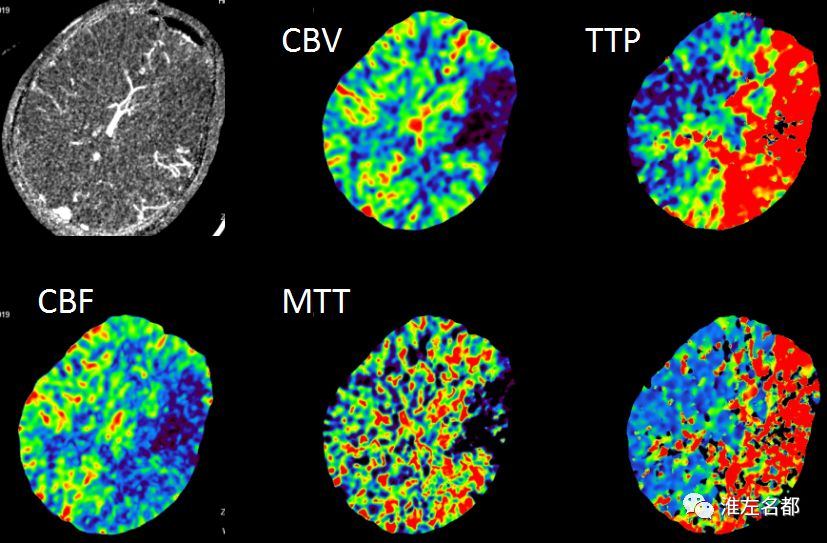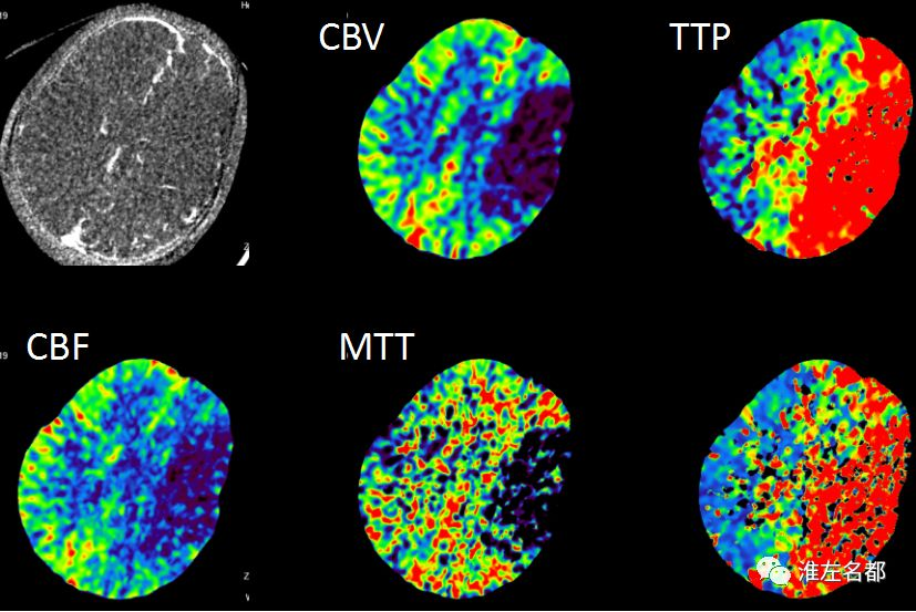 △脑CTP:左侧半球大范围TTP较对侧显著延长,左侧大脑中动脉上干供血区CBV和CBF显著降低。