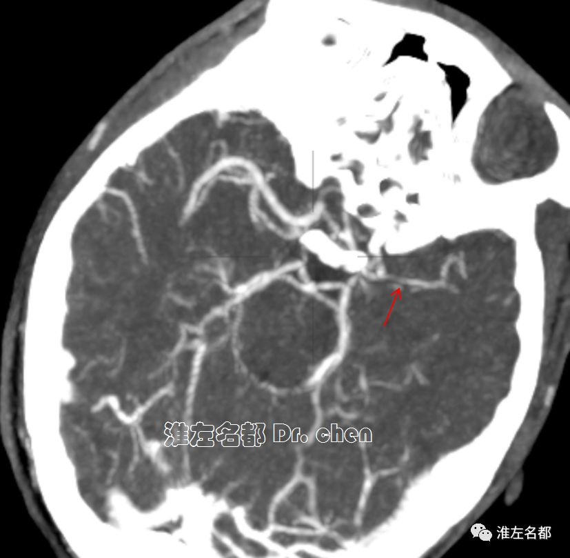△脑CTP静脉早期多平面重建:左侧大脑中动脉主干显影细小(红箭)