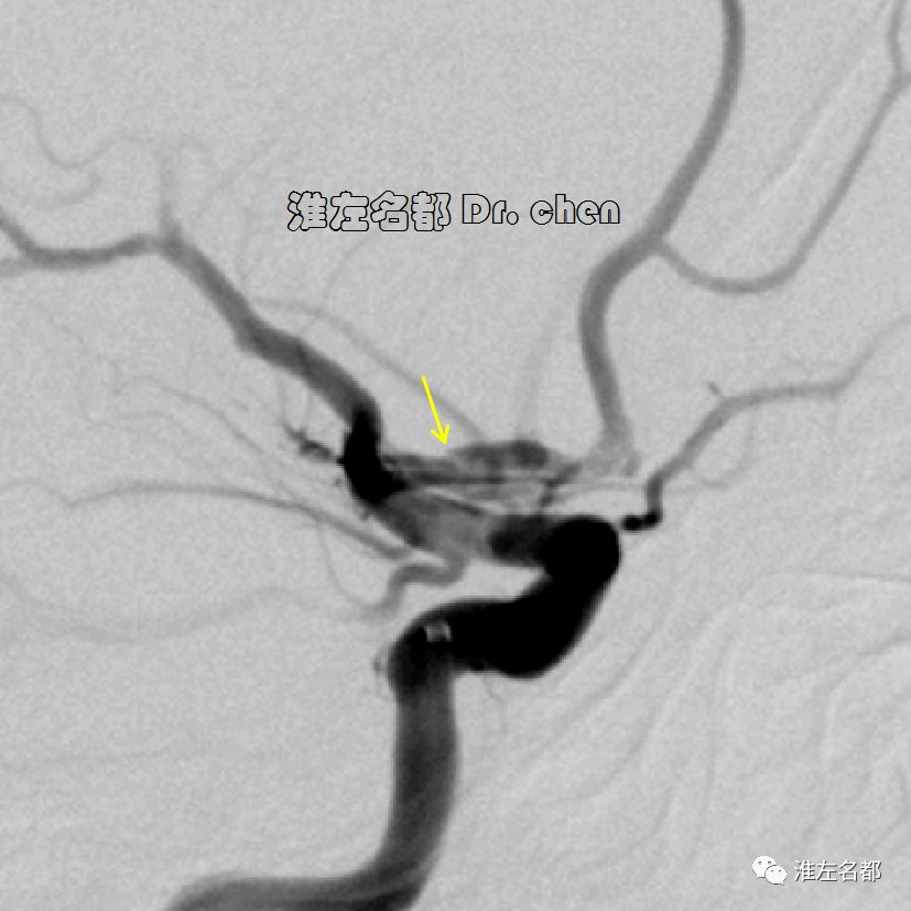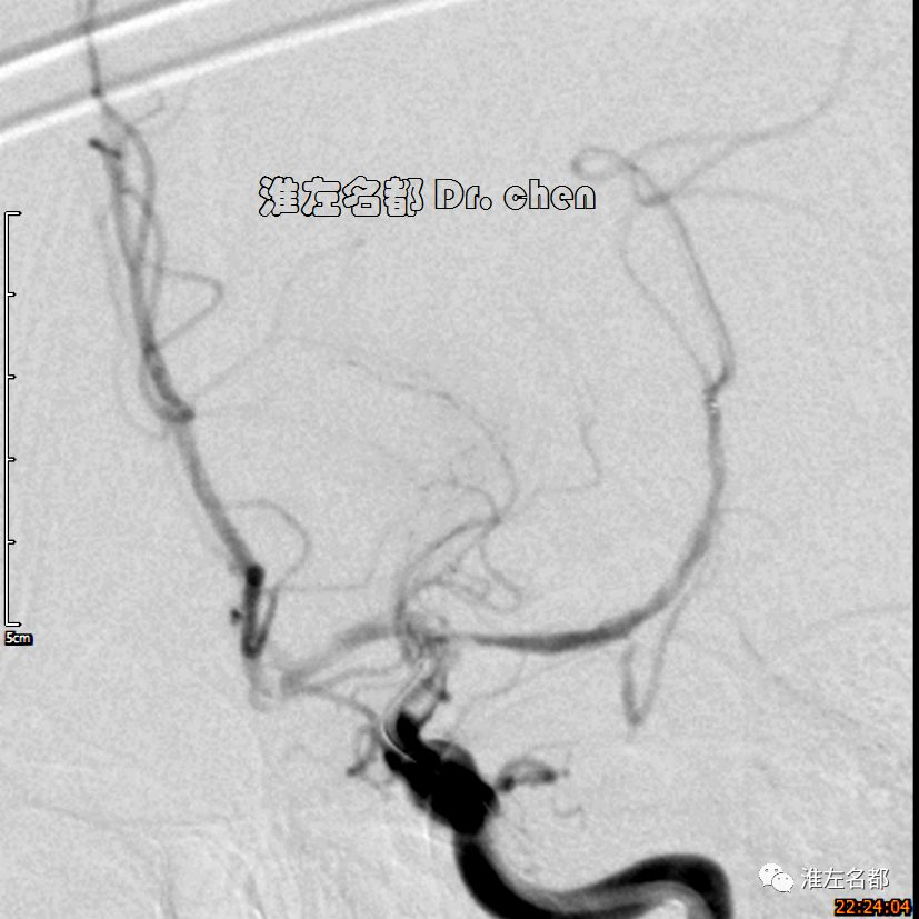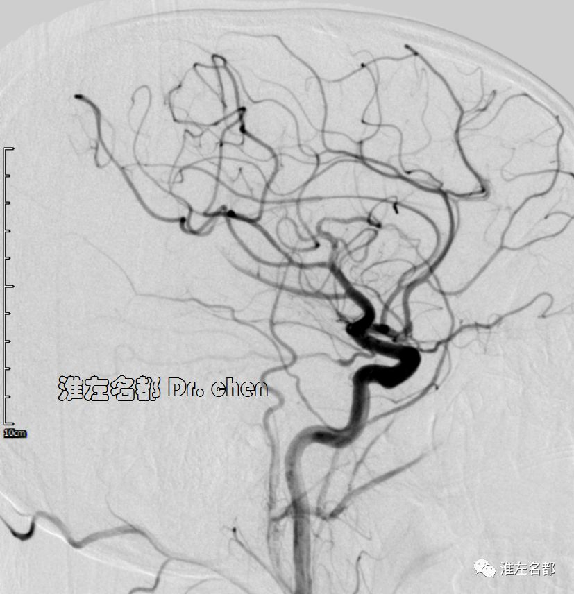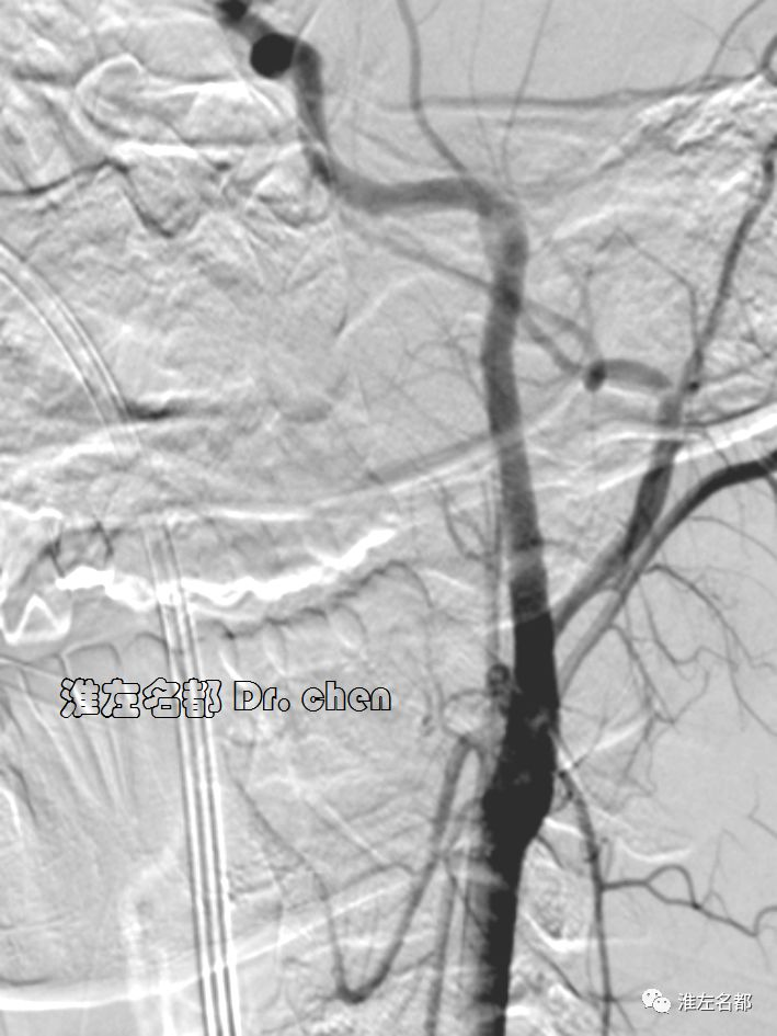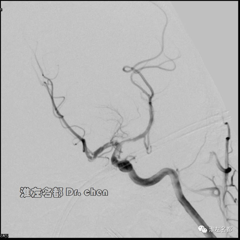 6.在夹层真腔得以基本恢复后,DSA于左侧颈内动脉末端、大脑前和中动脉近端均检测到典型“内膜征”,进一步确定了夹层诊断。