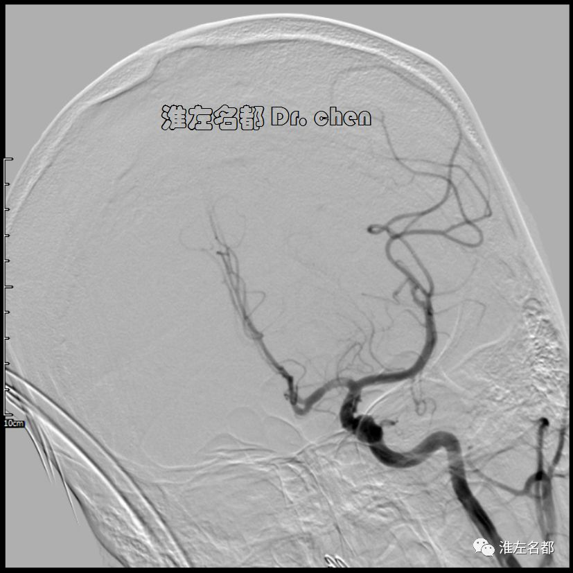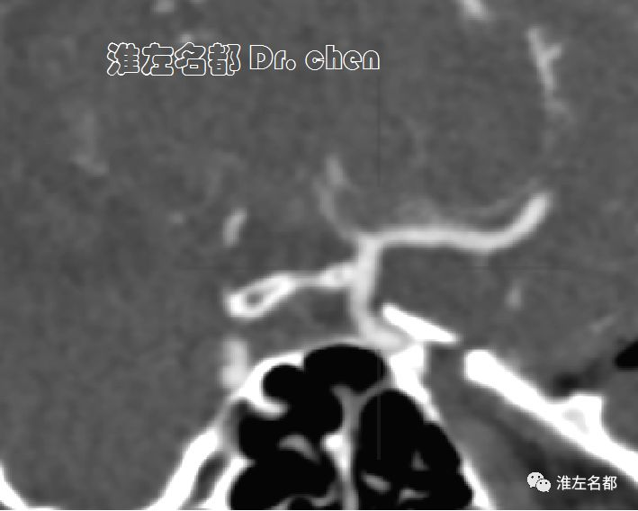△头颅CTA:左侧颈内动脉末端和大脑中动脉未见显影;左侧颈内动脉显影较右侧细小,造影剂浓度淡(提示血流缓慢)。