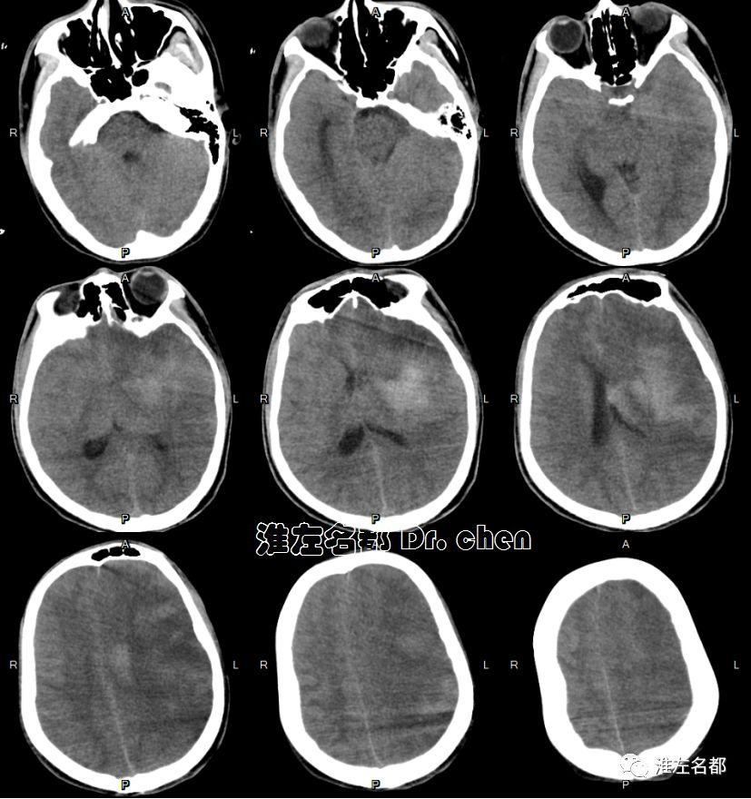 △头颅CT平扫:左侧半球大范围低密度,灰白质分界消失,脑沟受压变小-消失;左侧大脑中动脉区ASPECT-2。
