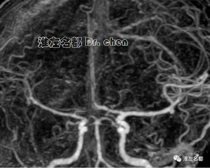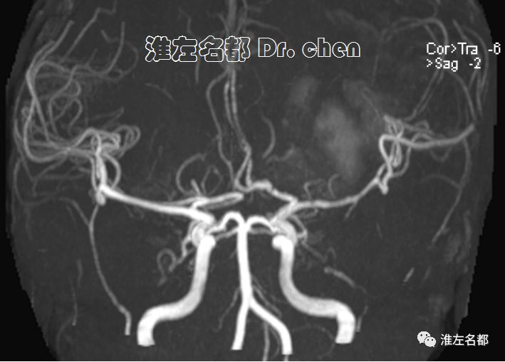 △3D-TOF-MRA:左侧大脑中动脉M1段和前动脉A1段管腔显影不规则;左侧大脑中动脉分支显影较对侧稀疏(考虑和大面积梗死后供血需求降低有关)。