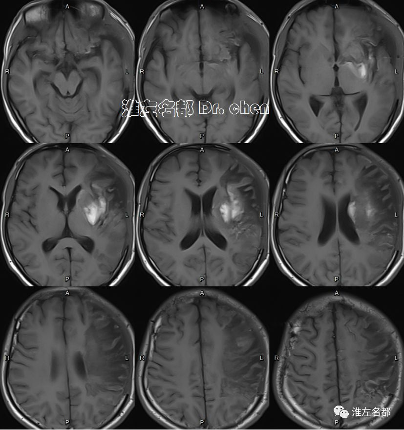△头颅CT平扫:左侧去骨瓣减压术后,左侧半球仍有肿胀,中线结构移位较前稍改善。