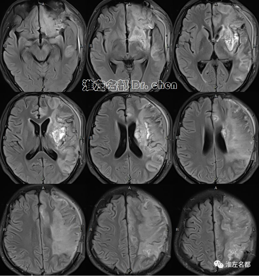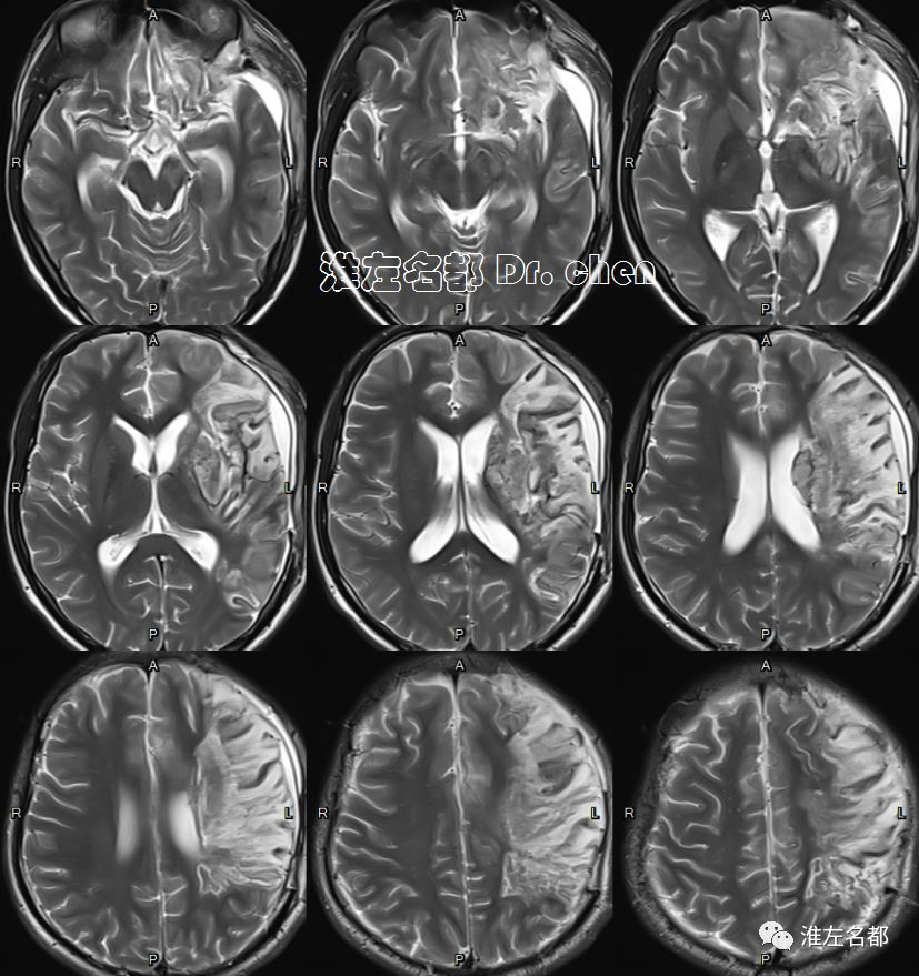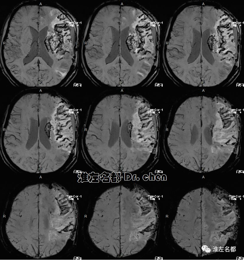 △T2WI、T1WI、FLAIR和SWI:左侧半球大面积亚急性梗死伴渗血,局部软化坏死。