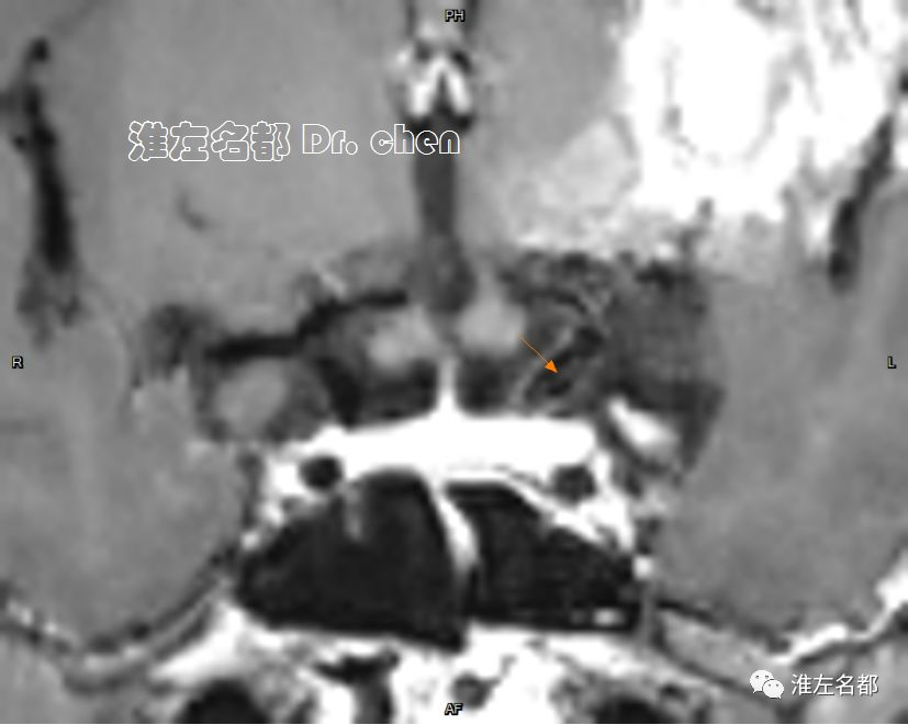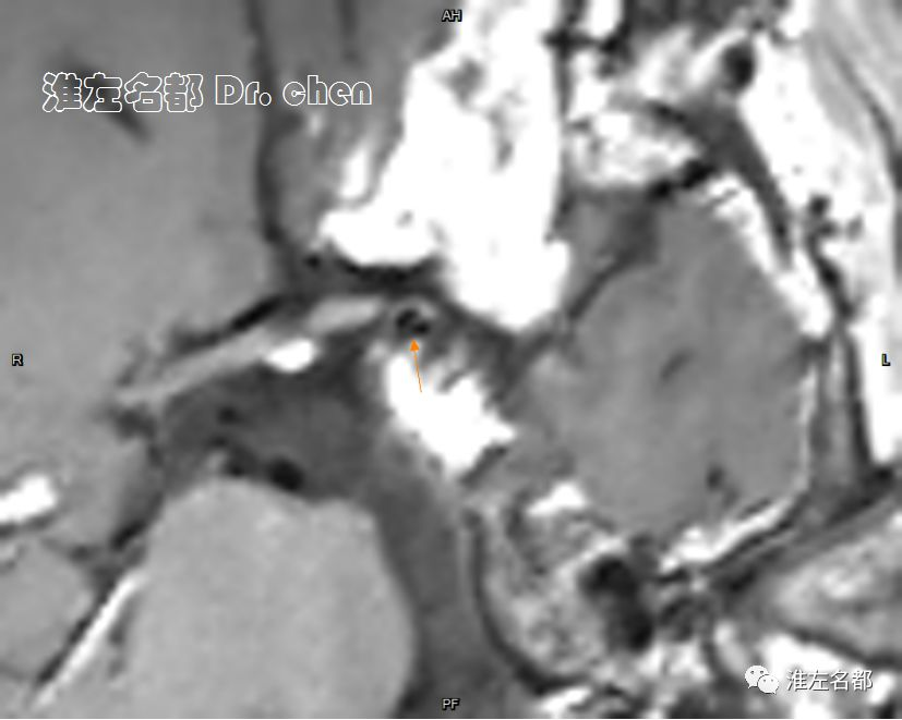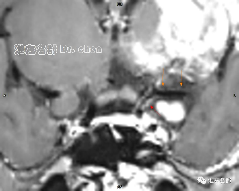 △管壁高分辨MRI(增强T1-SPACE):左侧大脑中动脉主干管壁未见异常(橙箭),左侧颈内动脉远端管壁增厚和强化(红箭)。