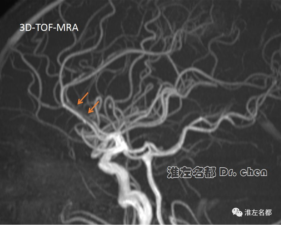 △3D-TOF-MRA和DSA:左侧大脑前动脉A2长节段不规则狭窄(橙箭)