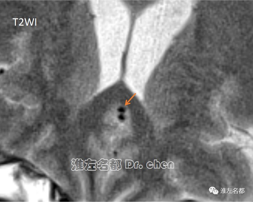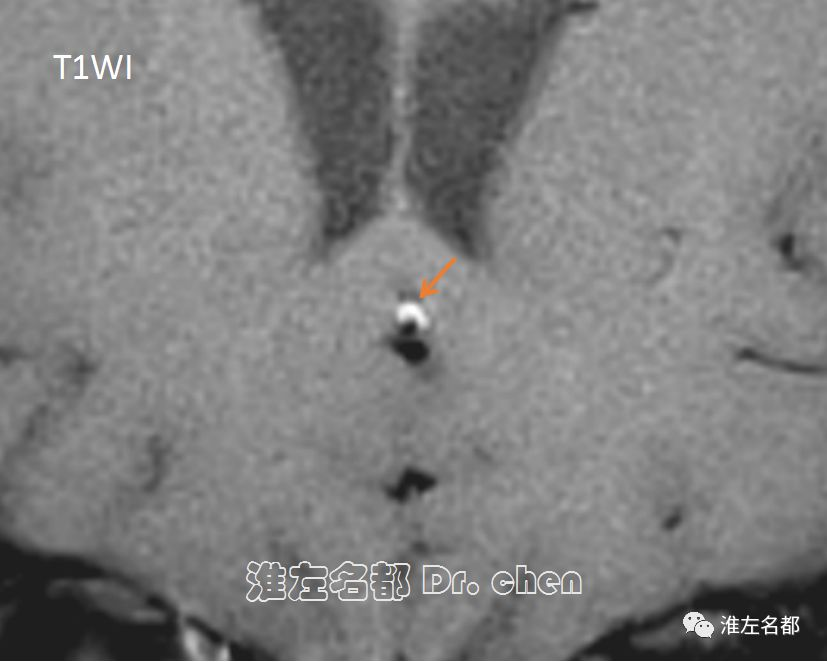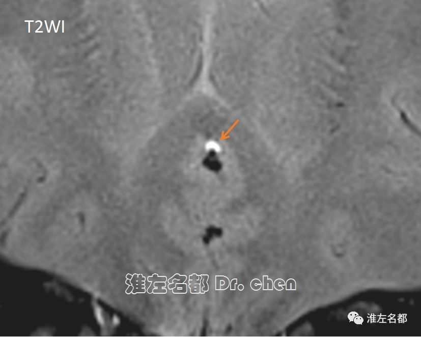 △发病3个月管壁高分辨MRI之T2WI:原左侧大脑前动脉A2段夹层壁内血肿已吸收,管腔恢复正常(橙箭)