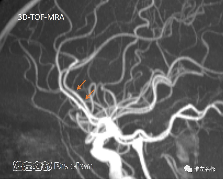 △发病3个月3D-TOF-MRA:原左侧大脑前动脉A2段狭窄已完全缓解(橙箭)