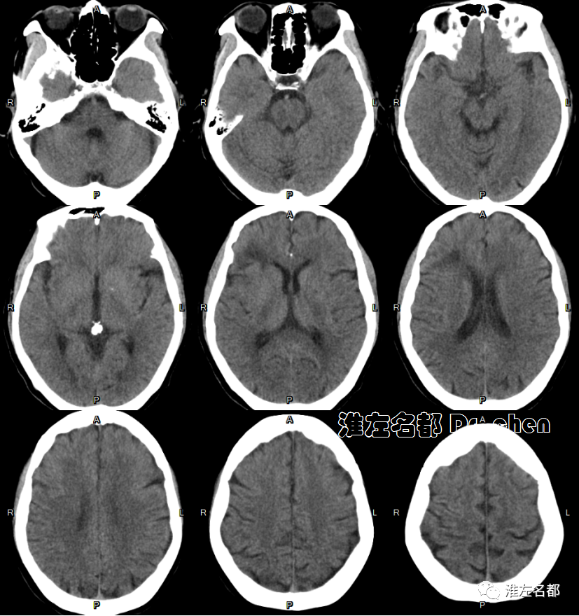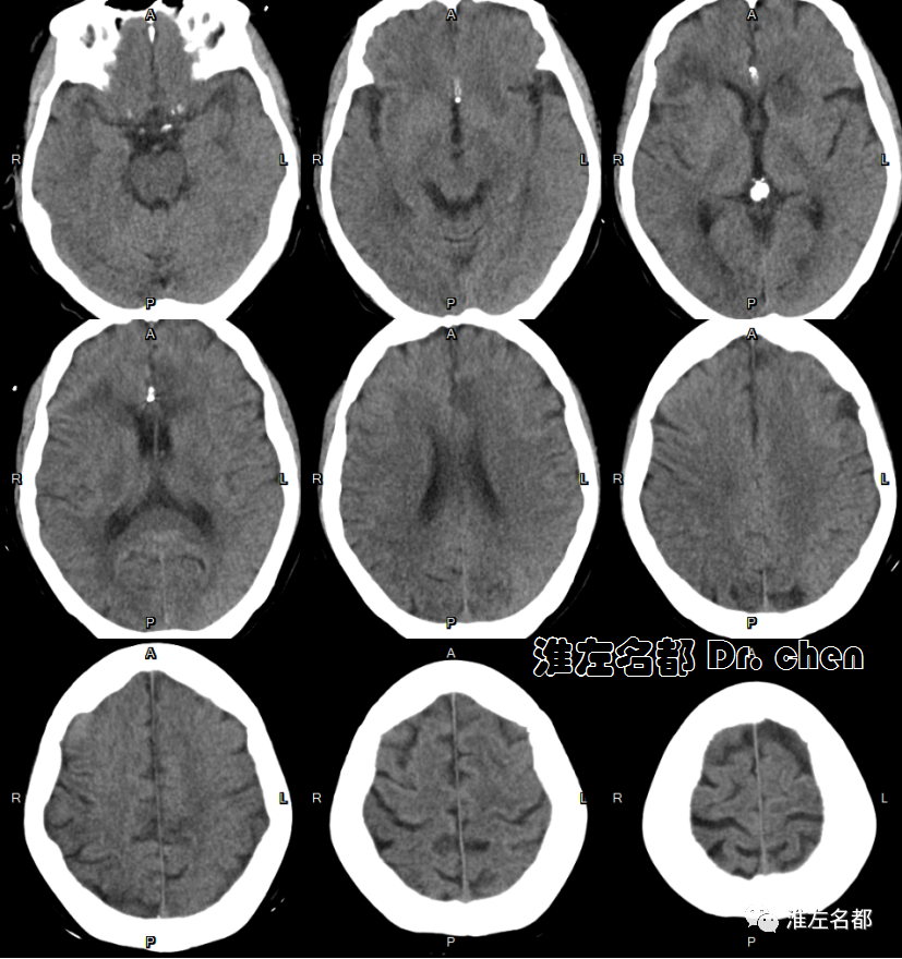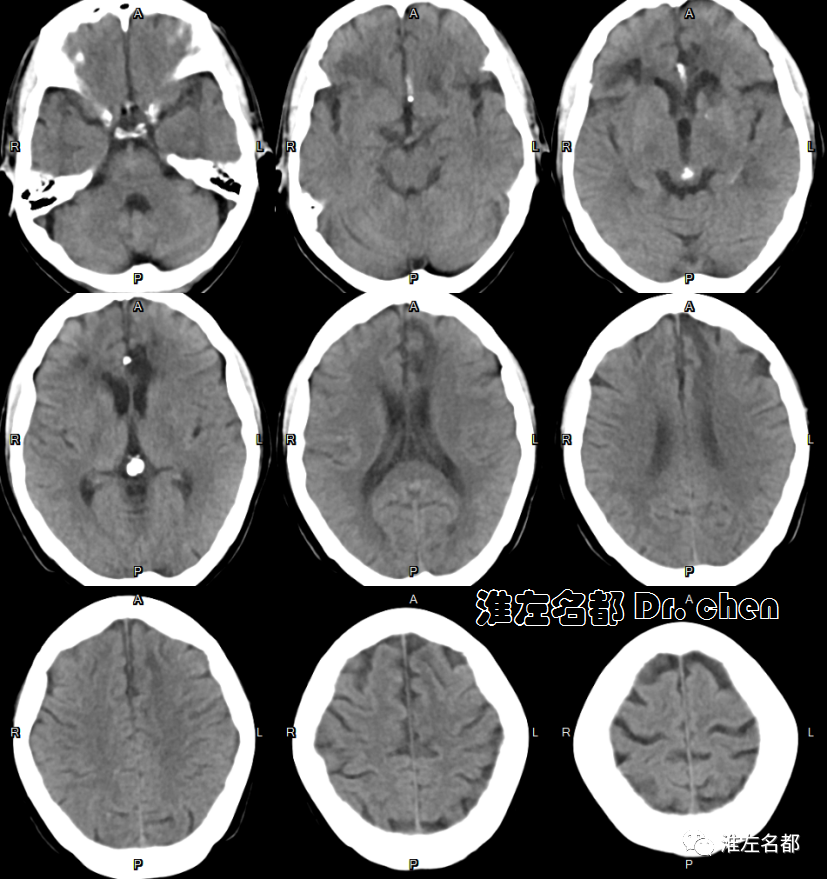 △颅脑CT平扫:左侧尾状核头部、胼胝体膝部和临近额叶陈旧性梗死,局部坏死液化;右侧额叶陈旧性梗死。