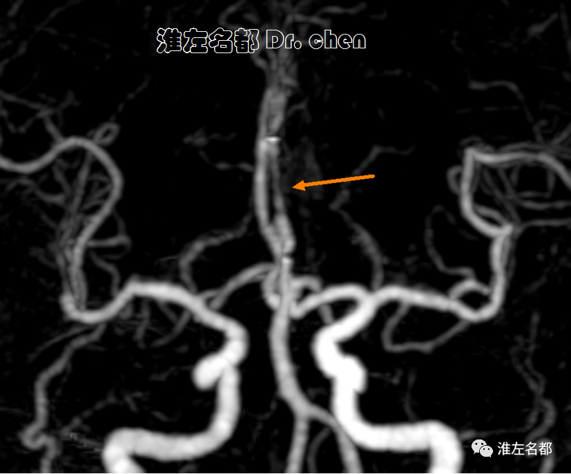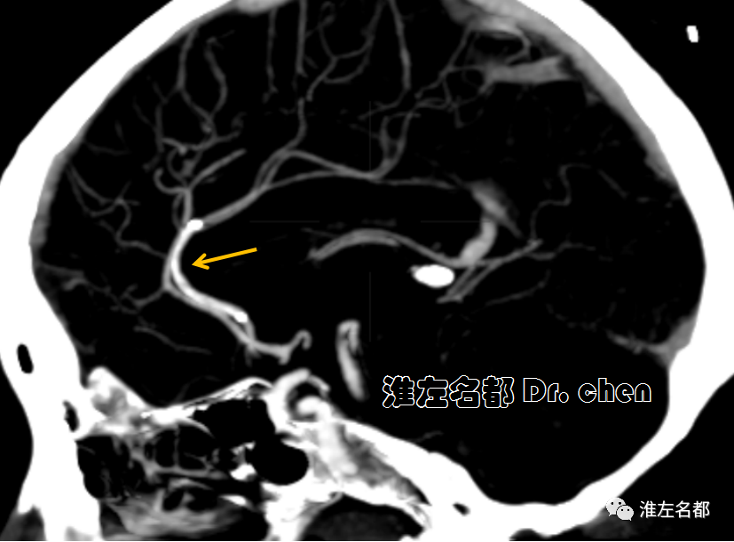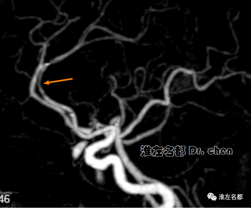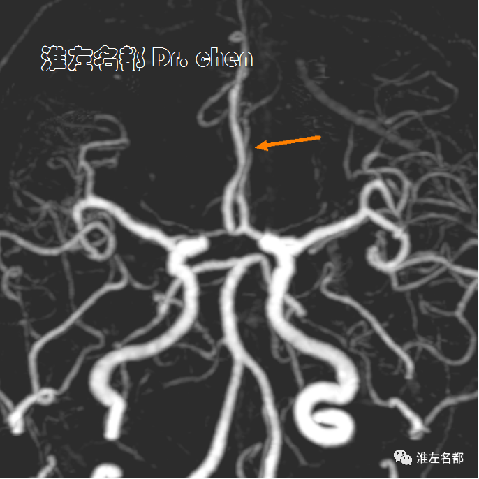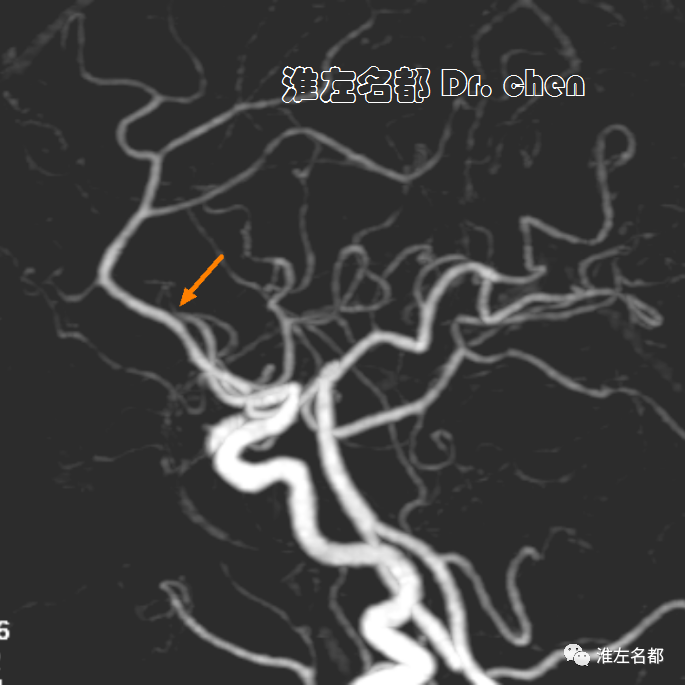 △颅脑CTA:左侧大脑前动脉A3段狭窄(橙箭),但前向血流可。