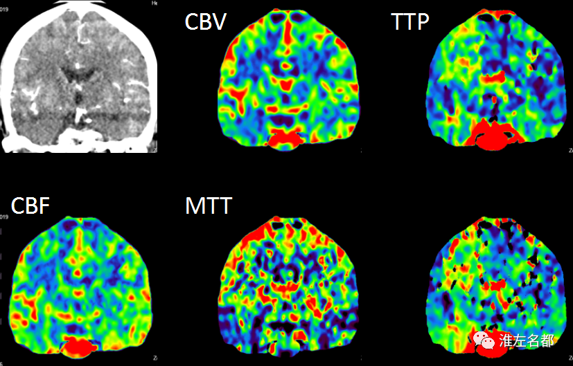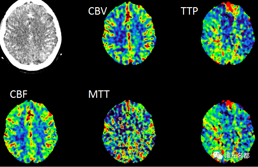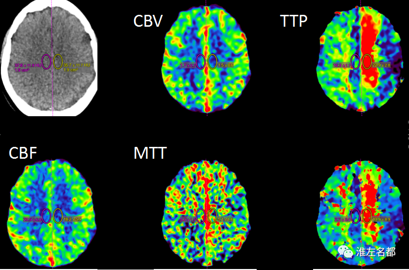 △脑CTP:左侧大脑前动脉区TTP较对侧显著延长,但其大部分区域CBV和CBF未见明显降低。