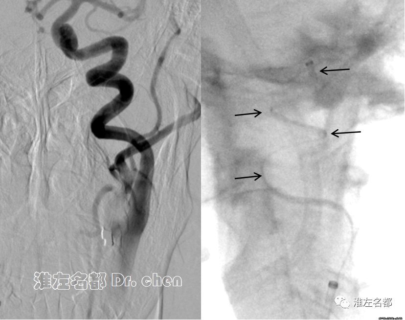 △采用同轴技术将6F长鞘(90cm,Cook)送至左侧颈总动脉,造影:左侧颈内动脉颅外段螺旋样延长迂曲,经.035”泥鳅导丝将中间导管(Navien 072, 105cm)头端送至岩骨段(黑箭)。