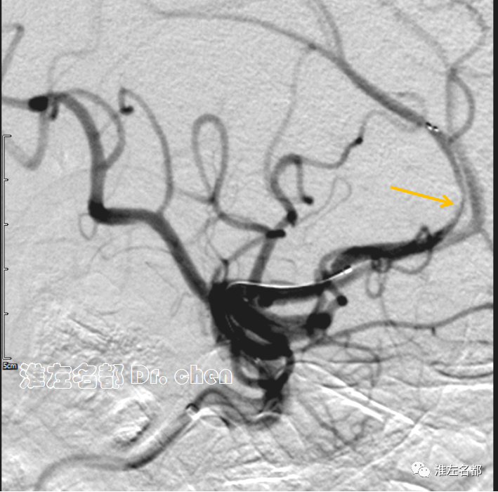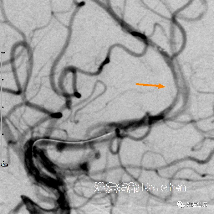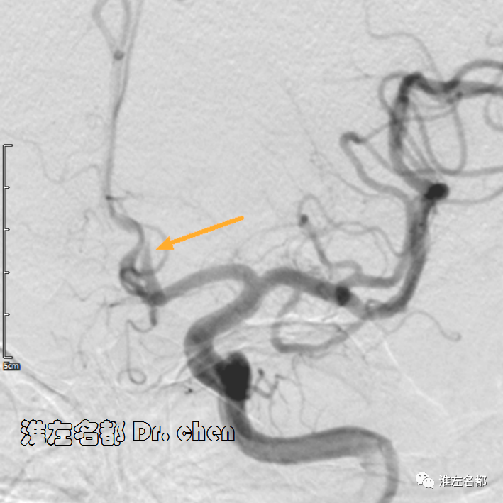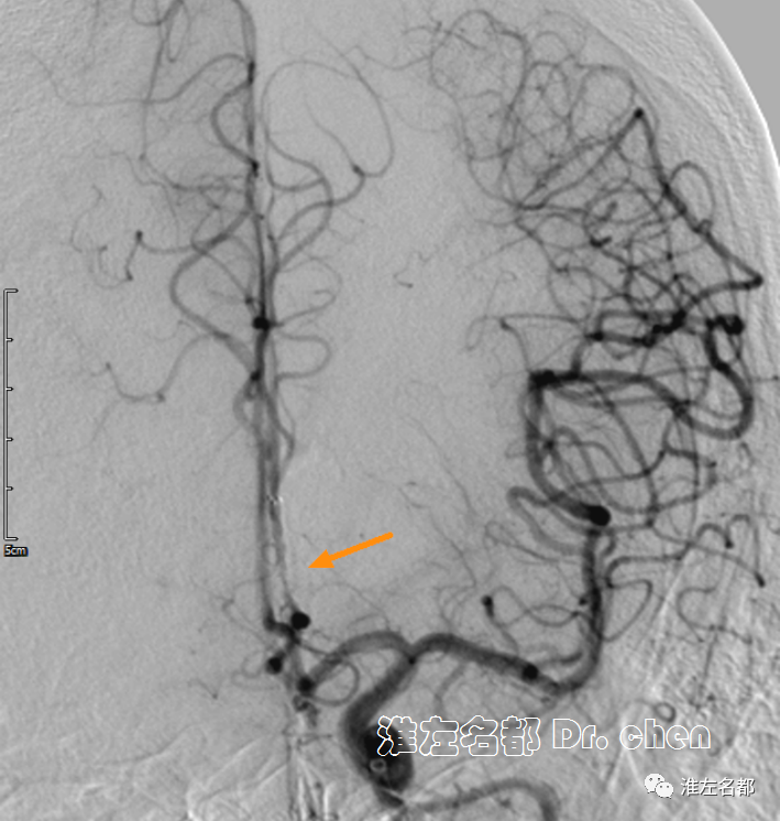 △30分钟后造影:左侧大脑前动脉前向血流良好,A3段局部中度狭窄(橙箭)