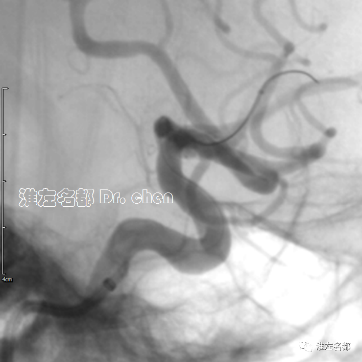 因路径迂曲,操作极其艰难,穿刺成功-第一次释放取栓支架已经花费了约60分钟。考虑到路径迂曲,回收支架出血风险高;如果第一次取栓未能开通闭塞,估计其后的操作可能还要花费很长时间,患者可能难以耐受,且取栓获益可能性也会降低。
