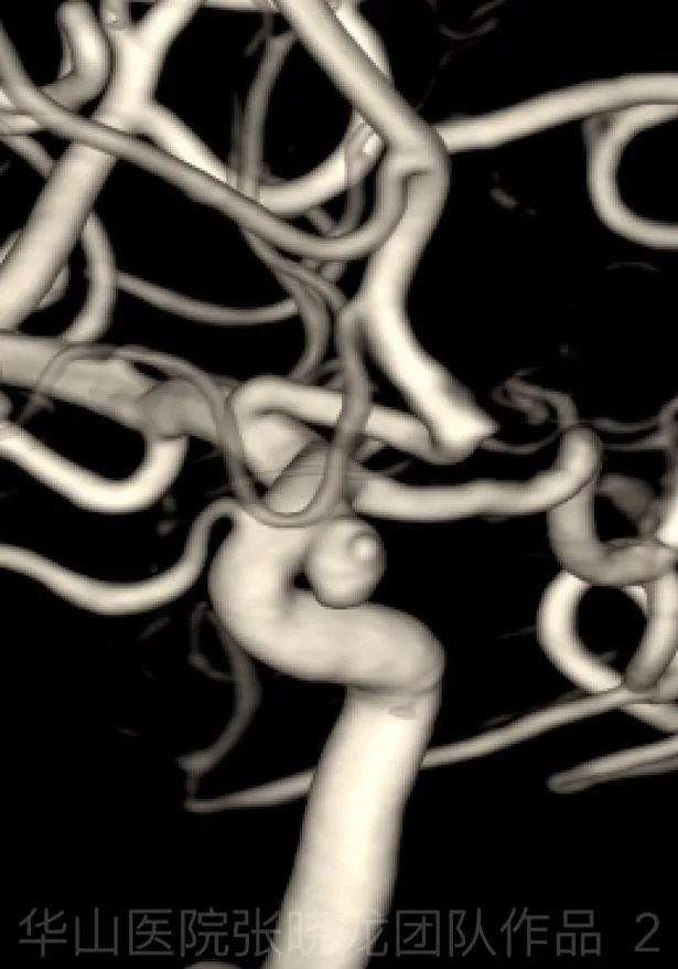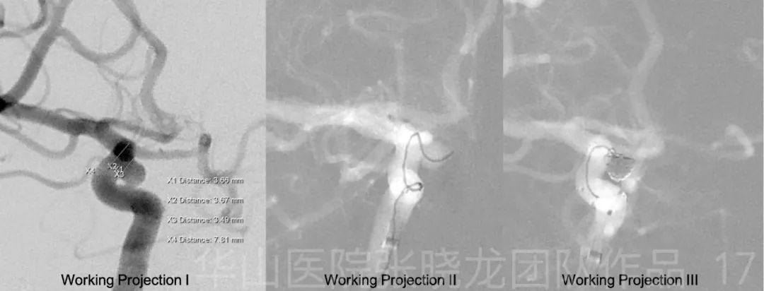 Figure 2. Working projection I was selected to show the aneurysm neck and proximal parent artery, not the daughter sac. 图 2. 工作角度 I 用于显示动脉瘤颈和近端载瘤动脉,而不是子瘤。