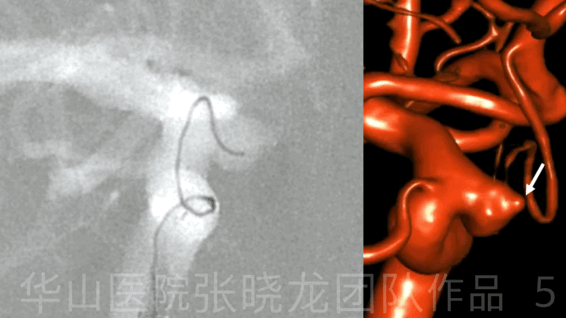 2.The daughter sac is the danger point of rupture which must be revealed clearly while embolizing the related region. The daughter sac could be embolized to avoid peri-operative hemorrhage after antiplatelet therapy. Small coils after the first two framing coils can penetrate into the daughter sac.