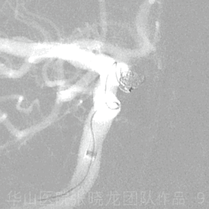 Figure 15 GIF. Post operative rotational angiography shows densely packing of the aneurysm with the parent artery patent. Tirofiban (Xinweining) 10ml was administrated. 图 15. 术后旋转血管造影显示动脉瘤致密栓塞,载瘤动脉通畅。应用替罗非班(欣维宁)10ml。