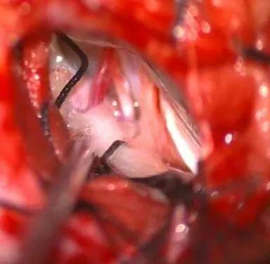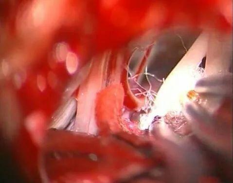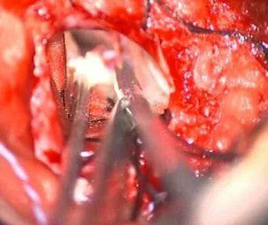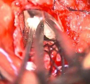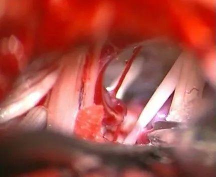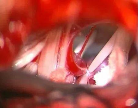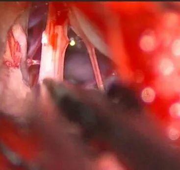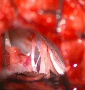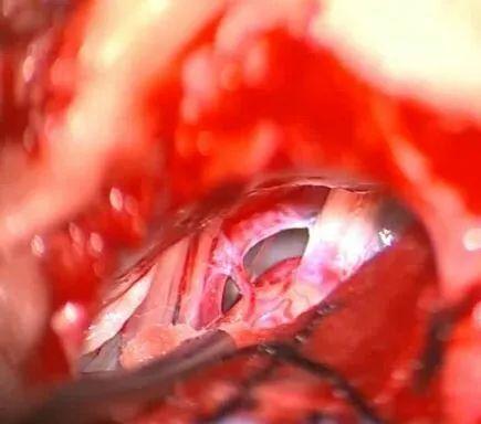 剥开听神经可见细长面神经,小脑前下从面听神经之间穿出,并与小脑后下动脉被蛛网膜包裹形成系带