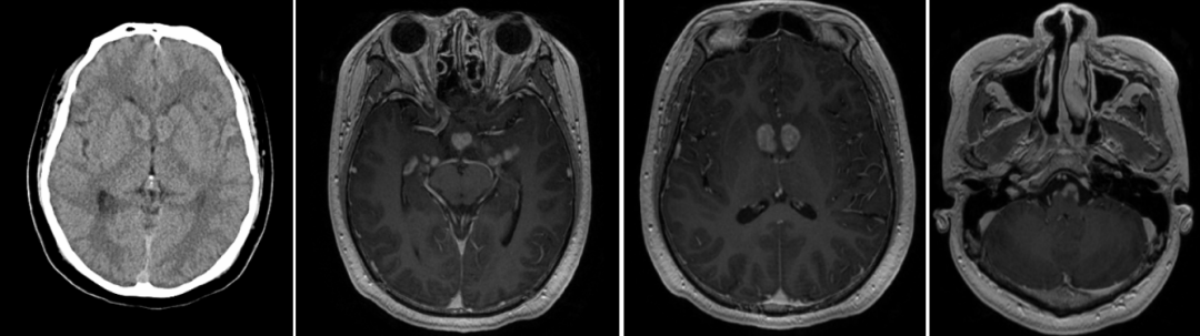 患者2年余前无明显诱因下出现多饮多尿,尿量不详,无明显头痛头晕、恶心呕吐,无发热消瘦乏力,无肢体水肿等,起初未予重视就诊。最近半年症状明显加重,到当地医院就诊,怀疑为“垂体性尿崩症”,行头颅MR增强检查,提示鞍上区占位伴脑内多发强化灶,考虑生殖细胞瘤伴脑内脑脊液播散,淋巴瘤待排。为求进一步诊治转来浙大二院。