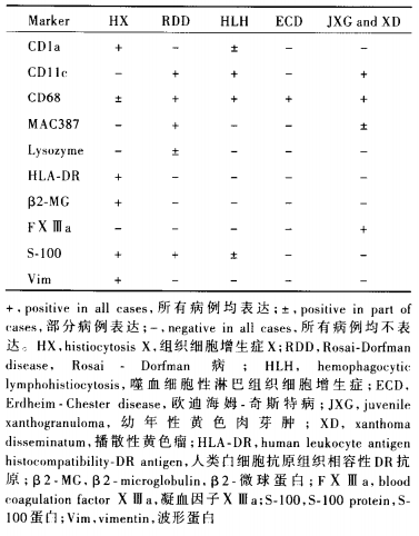 各种NLCH之间、NLCH与LCH之间,临床、影像学以及病理虽理论上各有不同,但均来源于组织细胞,不同类型的免疫学表型特征也较复杂,有文献总结见表2。故在实际诊断工作中,其细胞特征、免疫组化可出现重叠效应,有时可能需要反复的活检或手术才能明确。另外,NLCH(如ECD和XG)和LCH在同一患者可同时或依次发生。其病理生理尚有待于更深入的研究。