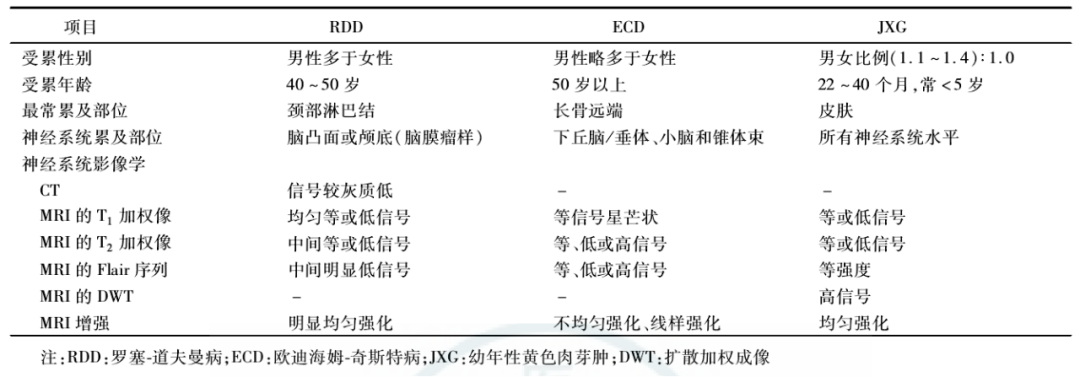 NLCH与LCH不同,并不起源于树突状朗格汉斯细胞,而是一组巨噬细胞增生性病变。是具有巨噬细胞分化特性的细胞的良性增殖性疾病。分为皮肤损害为主、皮肤和多系统受累、原发性皮肤外组织受累3种主要类型,包括罗塞-道夫曼病(Rosai-Dorfman disease, RDD)、欧迪海姆-奇斯特病(Erdheim-Chester disease, ECD)、幼年性黄色肉芽肿(juvenile xanthogranuloma, JXG)、成人黄色肉芽肿(adult xanthogranuloma, AXG)以及播散性黄色瘤(xanthoma disseminatum, XD)等。RDD,ECD,JXG是其中相对常见的NLCH,有文献总结其临床特点及影像学特征见表1。其诊断和鉴别诊断几乎完全依靠病理学检查。治疗上,目前没有统一方案,有的患者具有自愈倾向,有些患者预后较差。术后结合放疗及以长春新碱和糖皮质激素为主的化学治疗方法,有些患者病情能缓解、稳定甚至痊愈。