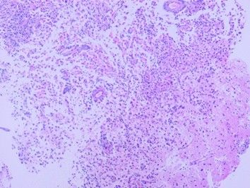 外院病理科会诊:大量炎性细胞渗出,伴有泡沫细胞形成,倾向炎性反应性改变。免疫组化结果:GFAP+,Ki-67少量+,MBP+,CD1a-,CD20-,CD3-,CD68/kpl-,S-100-。
