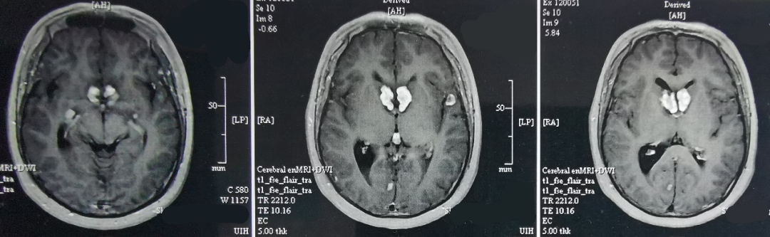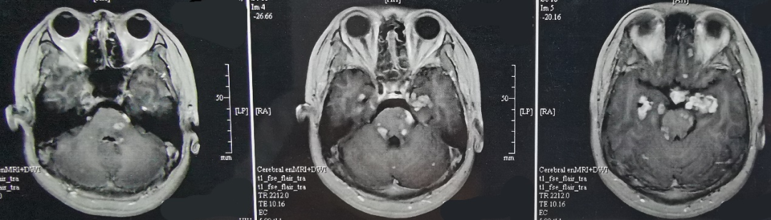 复查增强头颅MRI,提示两侧脑室旁、鞍上池区、松果体区、左侧额叶、右侧枕叶、两侧颞叶、桥脑、两侧小脑半球、延髓左腹侧,见多发大小不等结节状、团片状异常信号,增强后呈结节样、串珠样明显强化影(图1)。