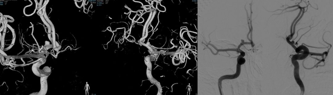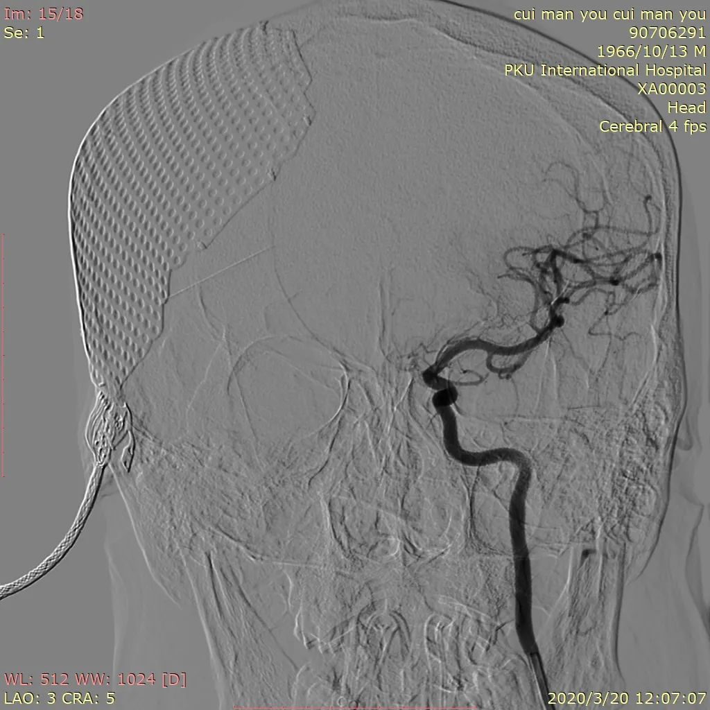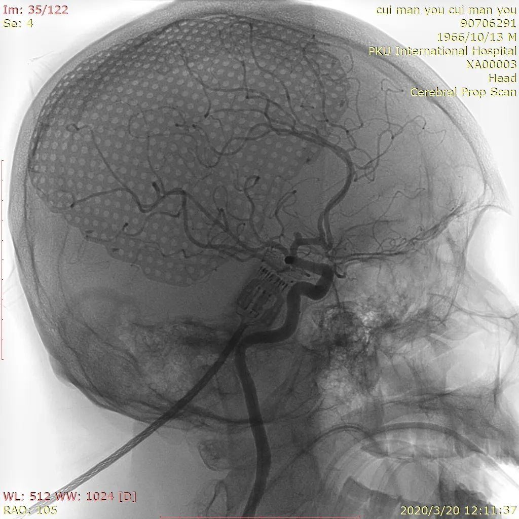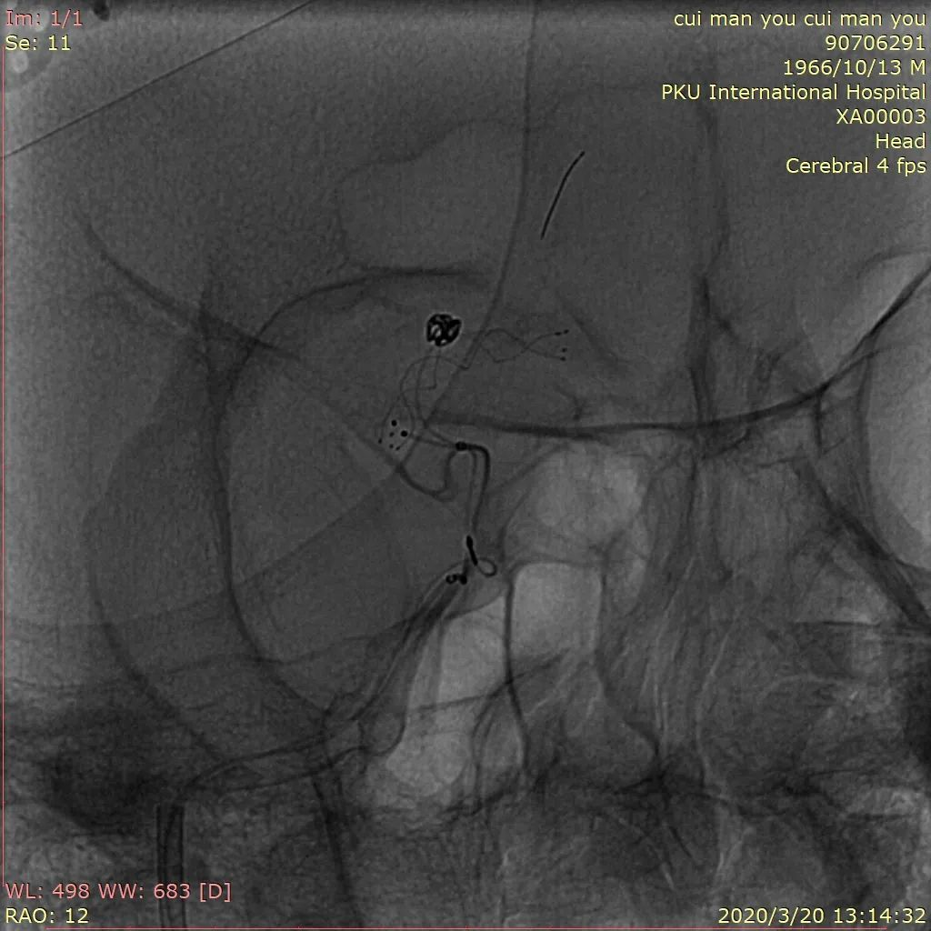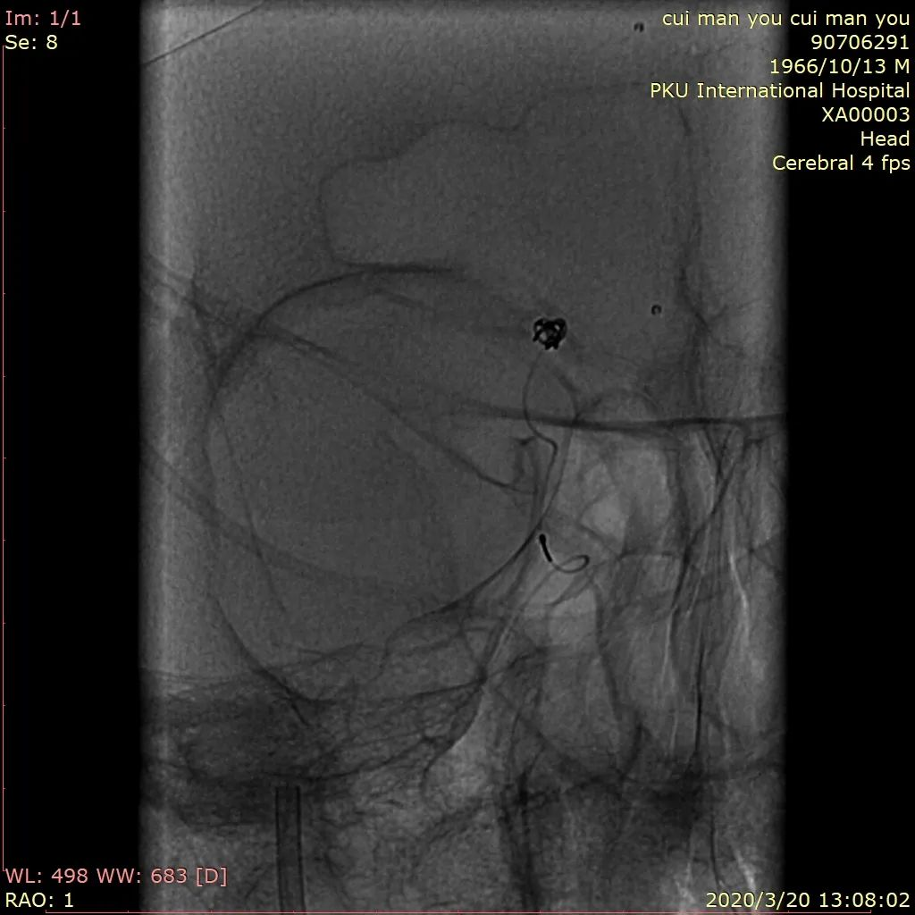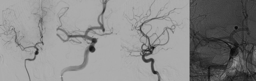 Synchro14微导丝携带S形塑形后Headwya17微导管反复尝试无法选入动脉瘤内,更换Headway17直头微导管再次尝试,少量回撤支架导管,再次阐释微导管头端进入动脉瘤内。管头位置满意后撤出微导丝,沿微导管送入Target 360 Ultra 2mm×4cm弹簧圈反复调整成篮,暂不解脱,沿支架管送入Lvis3.5mm*15mm支架,于A2打开支架头端缓慢回撤,支架头端位于前交通处时稳定支架管,推送支架,于瘤颈处稍增大力度推送,推送过程见支架尾端向大脑中动脉移行,遂保持张力原位释放,支架尾端部分疝入颈内动脉分叉部,疝出长度约1.5mm。解脱弹簧圈,继续沿微导管送入弹簧圈MicroPlex10 2mm/2cm CosmosComplex,弹簧圈尾端输送时微导管弹出动脉瘤,调整微导管头端位置,解脱后继续沿微导管送入Target 360 Ultra 1.5mm×2cm弹簧圈,输送过程微导管头端无明显移位,弹簧圈位置良好,造影见动脉瘤近全栓塞,载瘤动脉及分支血管通畅,再次尝试送入Target 360 Ultra 1.5mm×2cm弹簧圈,完全推出后调整投射角度,见弹簧圈部分位于支架与血管壁之间,遂撤出弹簧圈,再次造影见动脉瘤近全栓塞,载瘤动脉及分支血管通畅,遂结束手术。撤除各级导管系统,穿刺点封堵止血满意后加压包扎固定良好,患者麻醉苏醒后平车送回病房,术后给予监护、补液、吸氧、右下肢制动24小时、抗血小板等对症治疗,观察患者意识、瞳孔、肢体感觉及运动情况,及时对症处理。