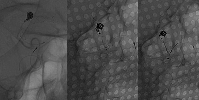 图6 最后一枚弹簧圈推送后更换角度见弹簧圈部分位于支架及血管壁之间,考虑对侧A1缺如,右侧A1重要,必须保留,撤出弹簧圈