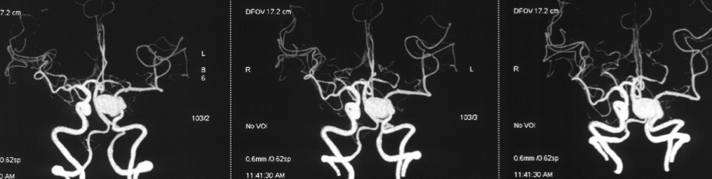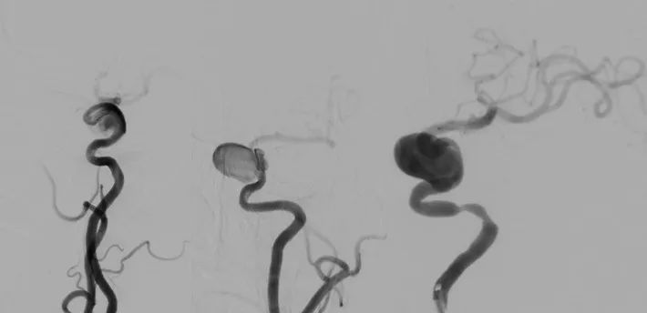 造影见左侧颈内动脉海绵窦段巨大动脉瘤,瘤体远端海绵窦水平段血管狭窄,眼动脉段血管扩张,左侧A1段缺如