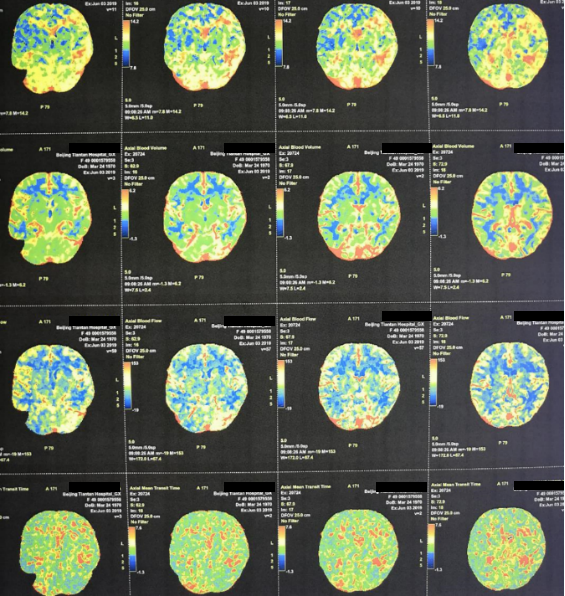 脑血管检查2021.02.20天坛医院:左侧大脑中动脉支架置入术后,局部管腔纤细,远端分支减少,左侧大脑后动脉P2局限性狭窄,左侧颞顶叶可见斑片状TTP,MTT延长,CBF略低。