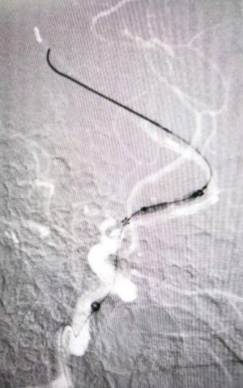 本例患者为大脑中动脉支架置入后再狭窄且有症状反复发生病情不稳定危险因素有18岁时即患有高血压高血压病史长血压控制不理想考虑支架置入后支架内再狭窄与血压控制不达标有关当然也可能存在其他因素。介入治疗指征明确术中普通球囊扩张后血管狭窄改善程度及形态均不满意再次狭窄可能性大给予药物球囊扩张后血管狭窄改善明显且血管壁光滑术中术后患者无不适查体正常继续严格控制危险因素定期复查。