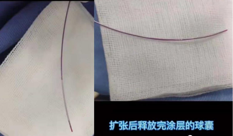 扩张前带涂层的球囊(左图)与扩张后释放完涂层的球囊(右图)
