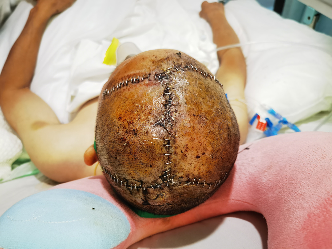 头皮留置两根引流管,因头皮游离面积范围大,避免皮下积液,前后各留置引流管,可见巨大“H”型手术切口,可见拐角处已完整缝合,脑组织未外露,但可见轻微渗出,每天予以络合碘纱布湿敷+可见光照射。