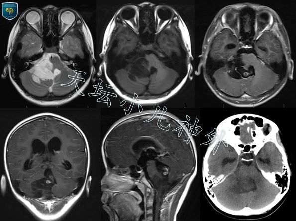 2021年1月接诊一例来自云南省昭通的11岁女性患儿(身高:154cm,体重:42kg),主诉:间断头痛伴恶心呕吐1年余,走路不稳1月。患儿1年前无明显诱因出现头痛,伴恶心及呕吐,间断发作、可自行缓解,未予重视;近1月来出现走路不稳、言语不利,进行性加重,于当地医院检查发现颅内病变,遂来我院就诊。门诊查体示:神清语利,自主体位,生长发育正常,右下肢肌力IV级,余神经系统查体阴性。头颅CT显示:第四脑室、右侧桥臂占位,稍低密度,室管膜瘤?星形细胞瘤?头颅MRI显示:右侧后颅窝至上段颈椎管内占位,室管膜瘤可能性大;胶质瘤待除外。为行手术治疗,门诊以“延颈髓交界区病变”收入院。
