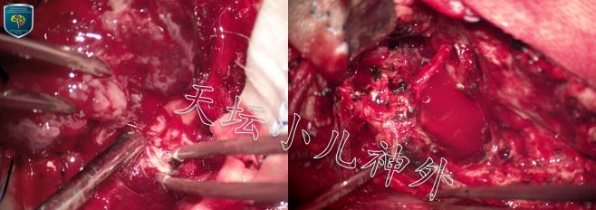 图2.术中见肿瘤色灰红、质地软韧不均、部分呈烂鱼肉样,血供丰富,起源于右侧桥臂,与四脑室底、延颈髓背侧无粘连,易游离;突入右侧隐窝部分,质地硬韧,包绕后组颅神经、PICA分支、边界不清,肿瘤镜下近全切除。