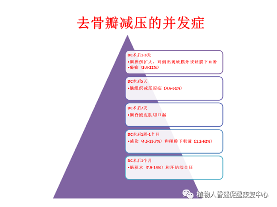 近期一项大型的随机试验证明了去骨瓣减压术可以降低难治性颅内高压的死亡率,所以说关键时候去骨瓣减压是救命的一根重要稻草。但是颅骨去除后会引起各种并发症。如下图: